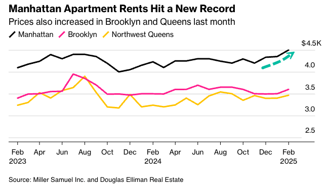 Last month, signed new leases in Manhattan rose 6.4% to $4,500—$100 higher than the previous record set in the summer of 2023—according to Bloomberg, citing new data from appraiser Miller Samuel and brokerage Douglas Elliman.