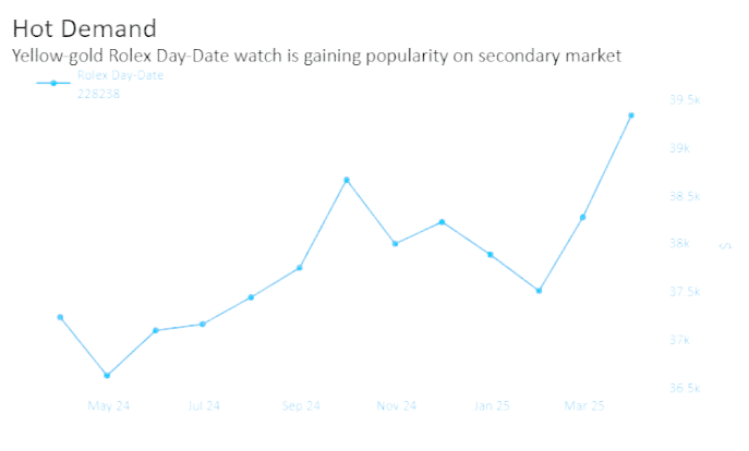 The yellow-gold Day-Date 228238, which Rolex suggests retailing for €43,800 ($48,050), was the index's fastest climber, rising from 30th place to ninth in that period.