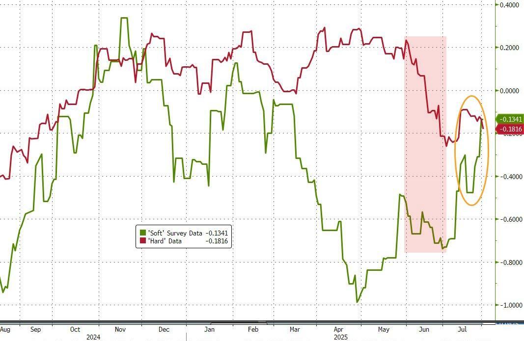 'Hard' data has disappointed in recent weeks (most notably today's payrolls miss) and while soft data overall has been rising, today's Manufacturing surveys were expected to show deterioration (after a rebound from April lows).