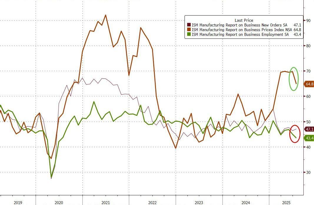 The Employment component confirms this morning's payrolls weakness, New Orders remain in contraction, but the silver lining is that fears of inflation are falling...