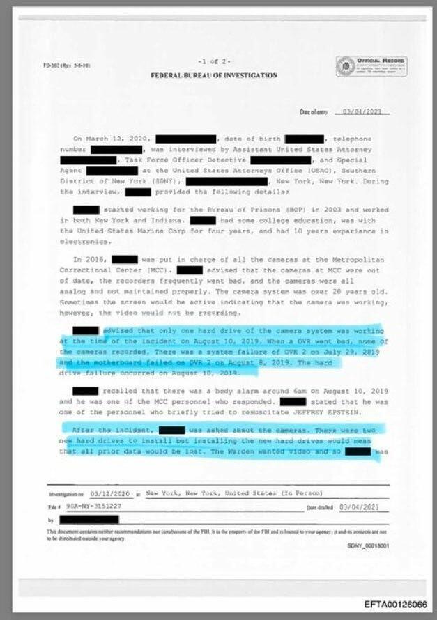 Then there are the jail’s surveillance hard drives. The Epstein Files contain an FBI memorandum admitting that an FBI agent removed the hard drive from the jail’s camera system, wiping all of the data from the night Epstein died. The agent did this, they acknowledge, even as he knew doing so would result in the content’s corruption. This comes on top of two other surveillance systems that independently failed that night.