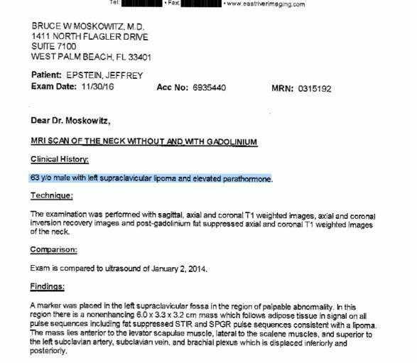 Jeffrey Epstein suffered from a roughly 6 cm lipoma (fatty tumor) in his left supraclavicular fossa — the area above his left collarbone — documented in 2016, 2017, and again in 2018. The 2016 report also references a similar exam from 2014. In 2016 there were communications about surgical removal. In 2017, Epstein’s assistant confirms he hasn’t had it removed. In 2018, it’s being MRI’d all over again.