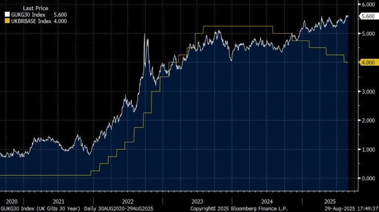 This likely reflects a level of concern from bond markets around deficits (which continue to rise)….inflation (above target and at-risk of rising w/tariff effects)…and risk premium for Fed independence. It also serves as a reminder for policymakers that the economy is most impacted by the long-end rate not the short-end (10x multiplier for FCI). Whilst these levels are still within acceptable ranges, one need only look over the pond at the UK to see what happens when investors are perennially concerned about governments’ ability to manage the fiscal outlook…30y Gilt yields (5.60%) have been rising consistently for four years now and have risen over 100bps since July 2024 when the BOE started cutting policy rates from 5.25% to 4.00%!