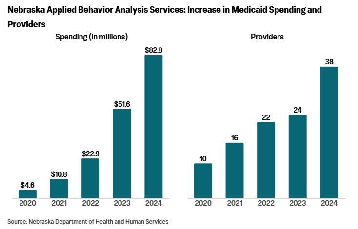 Nebraska’s Medicaid spending for applied behavior analysis increased notably over a similar time period. It grew by 1,700 percent from 2020 to 2024, according to a report last fall from the state’s Health and Human Services department.