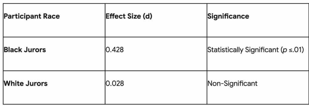The table tracks the effect size (d) of racial bias, where a positive number indicates a tendency to render harsher judgments against out-group defendants and more lenient judgments for in-group defendants. The data shows that black jurors exhibit a moderate, statistically significant in-group bias effect size of d = 0.428. In sharp contrast, white jurors demonstrate a negligible, statistically non-significant effect size of d = 0.028.
