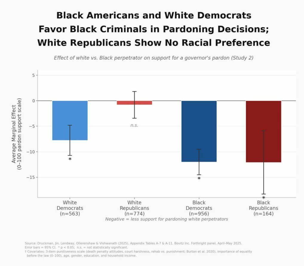 This dynamic is further corroborated by the U.S. pardoning-decisions bar chart titled “Black Americans and White Democrats Favor Black Criminals in Pardoning Decisions.”