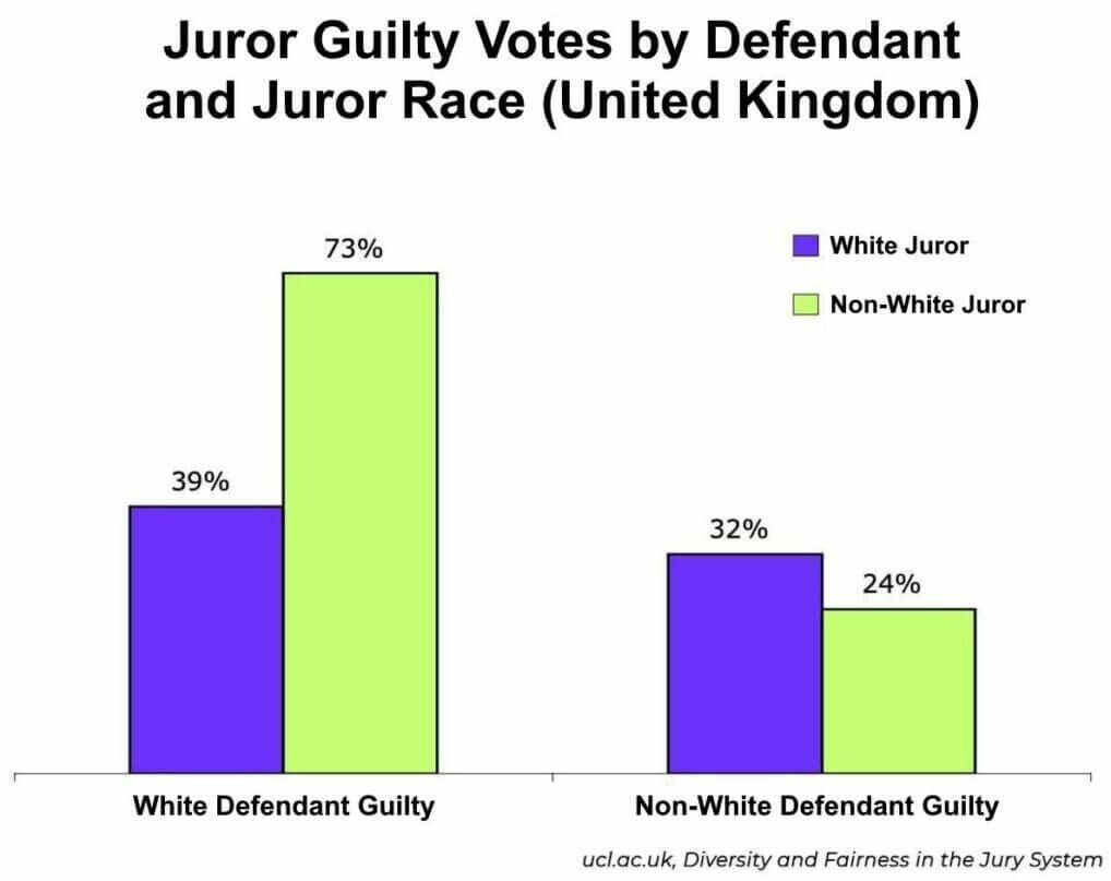 The United Kingdom is not immune to these exact same forces. Research by Cheryl Thomas at UCL provides what can only be described as the smoking gun of ethnic jury nullification.