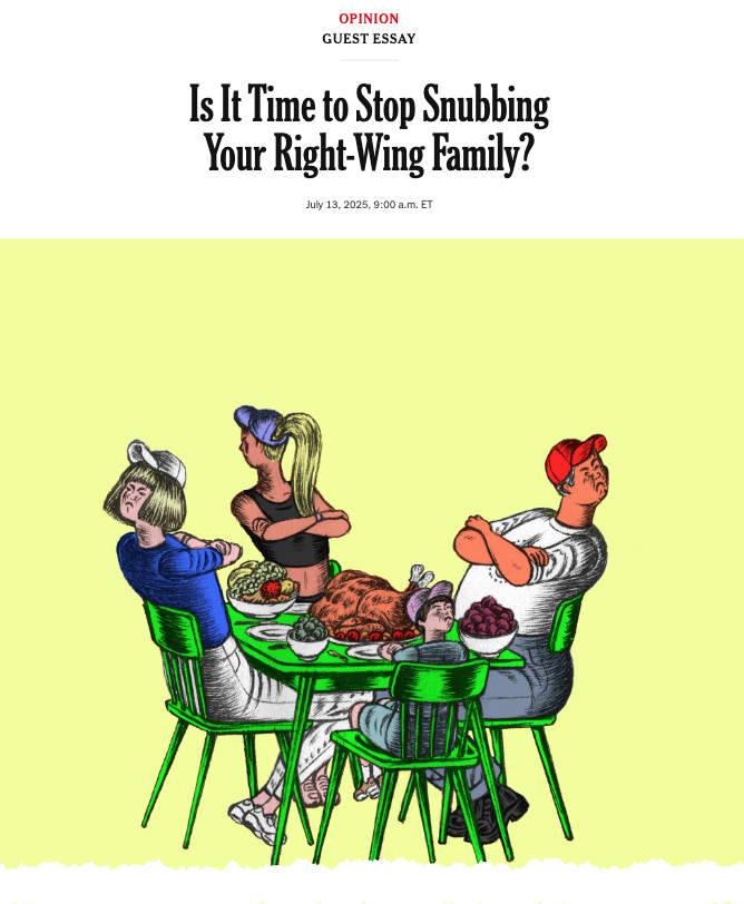 Thirty-eight-year-old David Litt, a liberal elitist who attended Yale University and later served as a speechwriter for President Obama, felt inspired to write a New York Times op-ed titled "Is It Time to Stop Snubbing Your Right-Wing Family?"