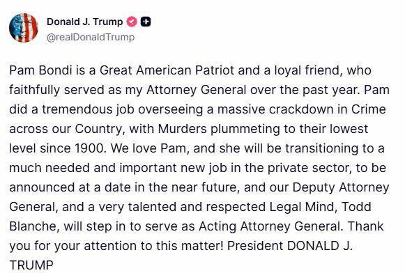 In a Thursday statement, Trump called Bondi "a Great American Patriot and a loyal friend, who faithfully served as my Attorney General over the past year," adding "she will be transitioning to a much needed and important new job in the private sector, to be announced at a date in the near future, and our Deputy Attorney General, and a very talented and respected Legal Mind, Todd Blanche, will step in to serve as Acting Attorney General."