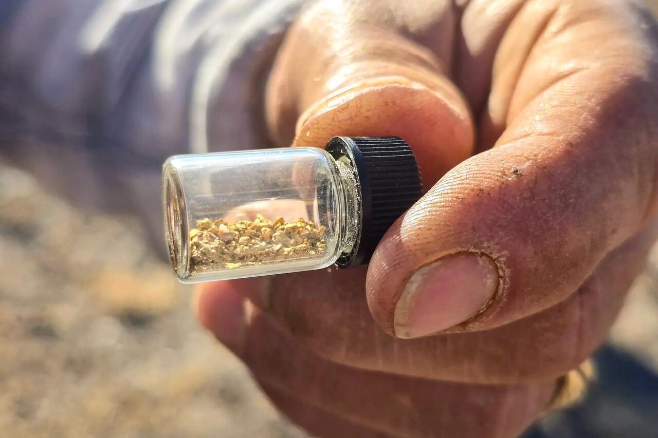 Joe Marihugh, from Tucson, Arizona, displays a vial containing roughly 1 gram of gold flakes he extracted from buckets of sand through a washer, on March 22, 2025. Allan Stein/The Epoch Times