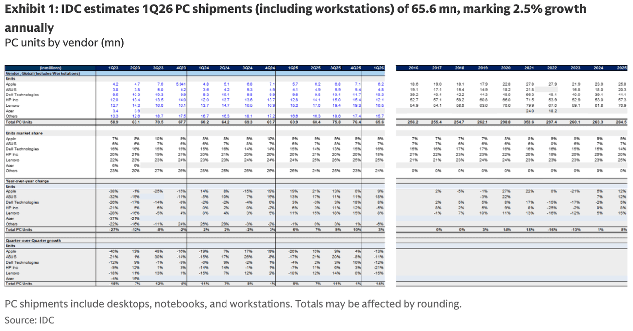 IDC estimates 1Q26 PC shipments (via Goldman):