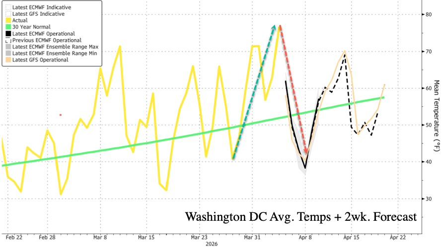 March temperatures across the Mid-Atlantic region were all over the place, swinging from the low 70s to cold and snowy the next day; the same pattern appears to be carrying into early April.